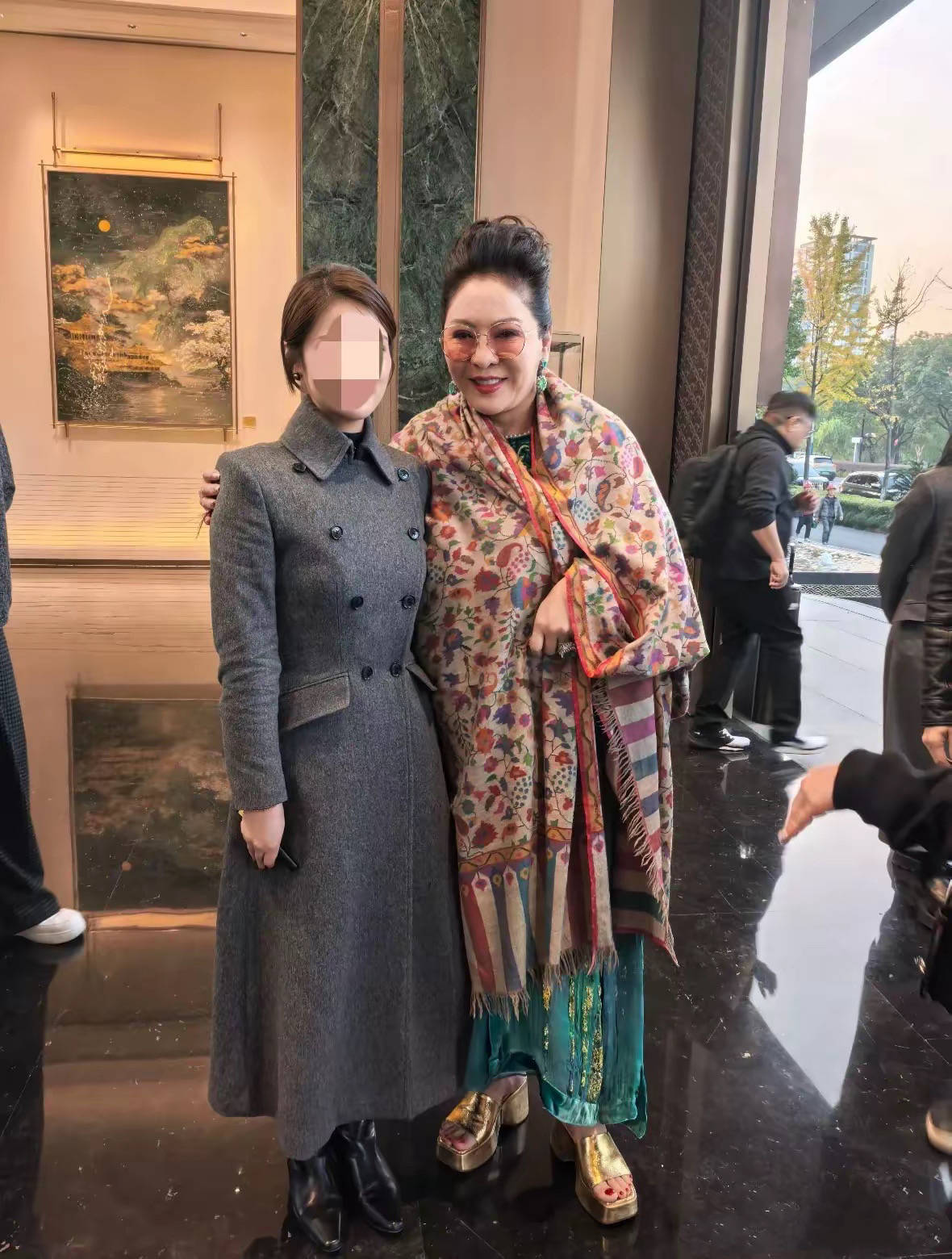 可能还是没有准备充分,向太到了看房的时候,就披上了她的羊绒披肩。这种羊绒披肩,向太也非常喜欢,很有贵妇范,看起来雍容华贵的。而和她合影的小姐姐,穿得是呢子大衣。